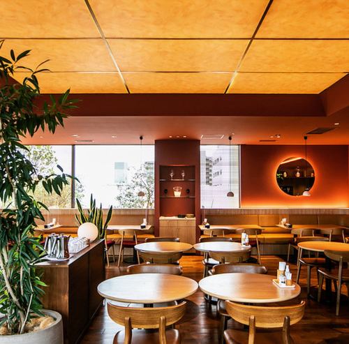 [RED ROOM] 的室内空间,红色与木纹的室内装饰形成鲜明对比。作为应对新冠病毒疫情的措施,我们增加了座位之间的距离,以便为您提供宽敞的座位区域。